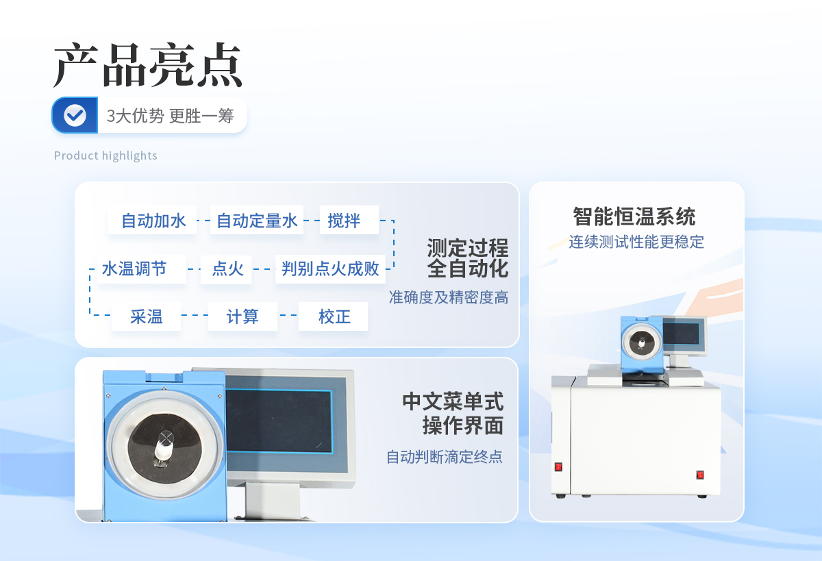 | 1、采用單片機系統來控制儀器,實現啟動后自動加水、自動定量水、攪拌、水溫調節,點火、判別點火成敗、采溫、計算、校正 。 | 2、裝氧彈外,實現測定過程全自動化,無人為誤差,準確度及精密度高。 | 3、中文菜單式操作界面,在中文大屏幕液晶提示下,用戶裝好氧彈即可完成實驗過程。 | 4、根據用戶需要可加備USB插口,和windowsXP操作系統,即可實現微機控制。 | 5、智能恒溫系統,連續測試性能更穩定、故障率低、系統常數和實驗結果可長時保存并且關機后不丟失等特點。 |