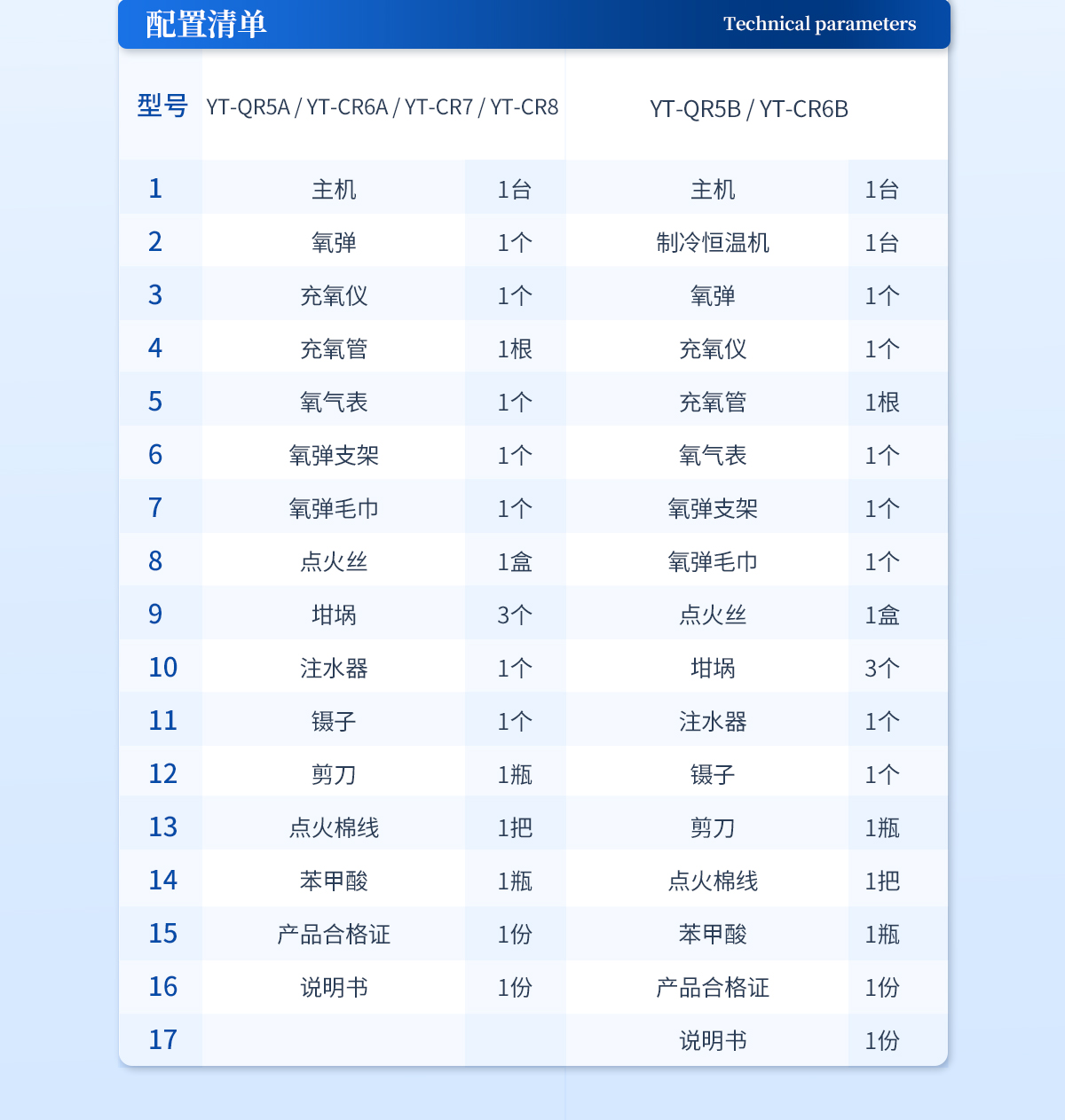 | 主機 1臺 | 制冷恒溫機 1臺 | 氧彈 1個 | 充氧儀 1個 | 充氧管 1根 | 氧氣表 1個 | 氧彈支架 1個 | 氧彈毛巾 1個 | 點火絲 1盒 | 坩堝 3個 | 注水器 1個 | 鑷子 1個 | 剪刀 1瓶 | 點火棉線 1把 | 苯甲酸 1瓶 | 產品合格證 1份 | 說明書 1份 |