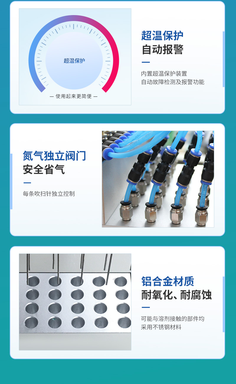 7.圓形氮吹儀的所有部件均勻不銹鋼制造,可耐酸堿等有機溶劑。
