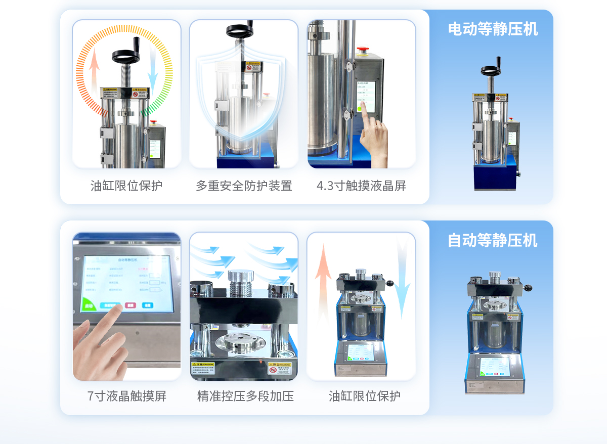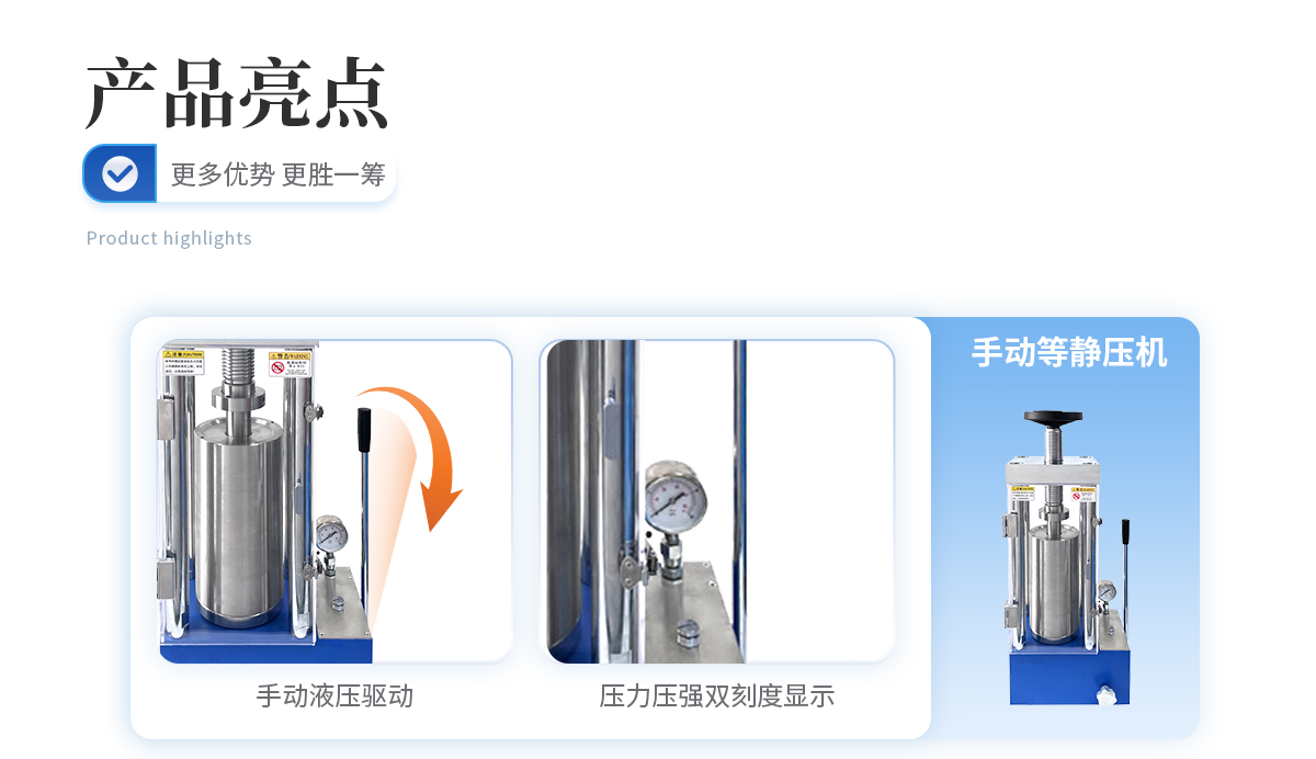該機采用電動液壓驅動,分體式結構,智能化的程序控制系統,安全可靠的防護裝置,制樣完畢可輕松拖動等靜壓腔體至取樣平臺,其操作簡便,取樣方便,適合需要大噸位、大物件樣品的等靜壓實驗。