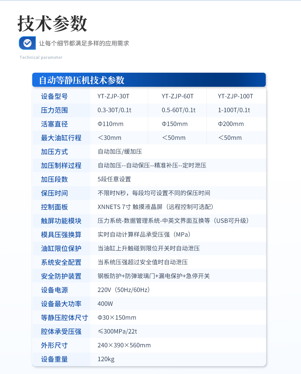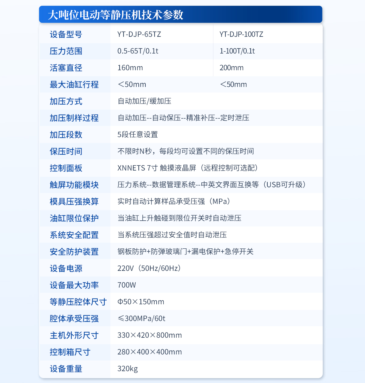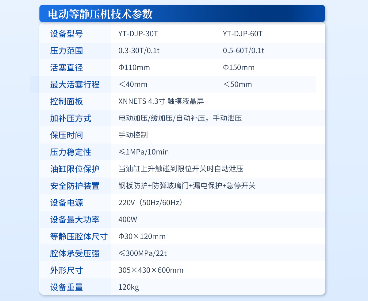 型號:YT-DJP-65TZ 設備簡介:該機采用電動液壓驅動,分體式結構,智能化的程序控制系統,安全可靠的防護裝置,制樣完畢可輕松拖動等靜壓腔體至取樣平臺,其操作簡便,取樣方便,適合需要大噸位、大物件樣品的等靜壓實驗。主要技術參數···   更新時間:2026-03-04
