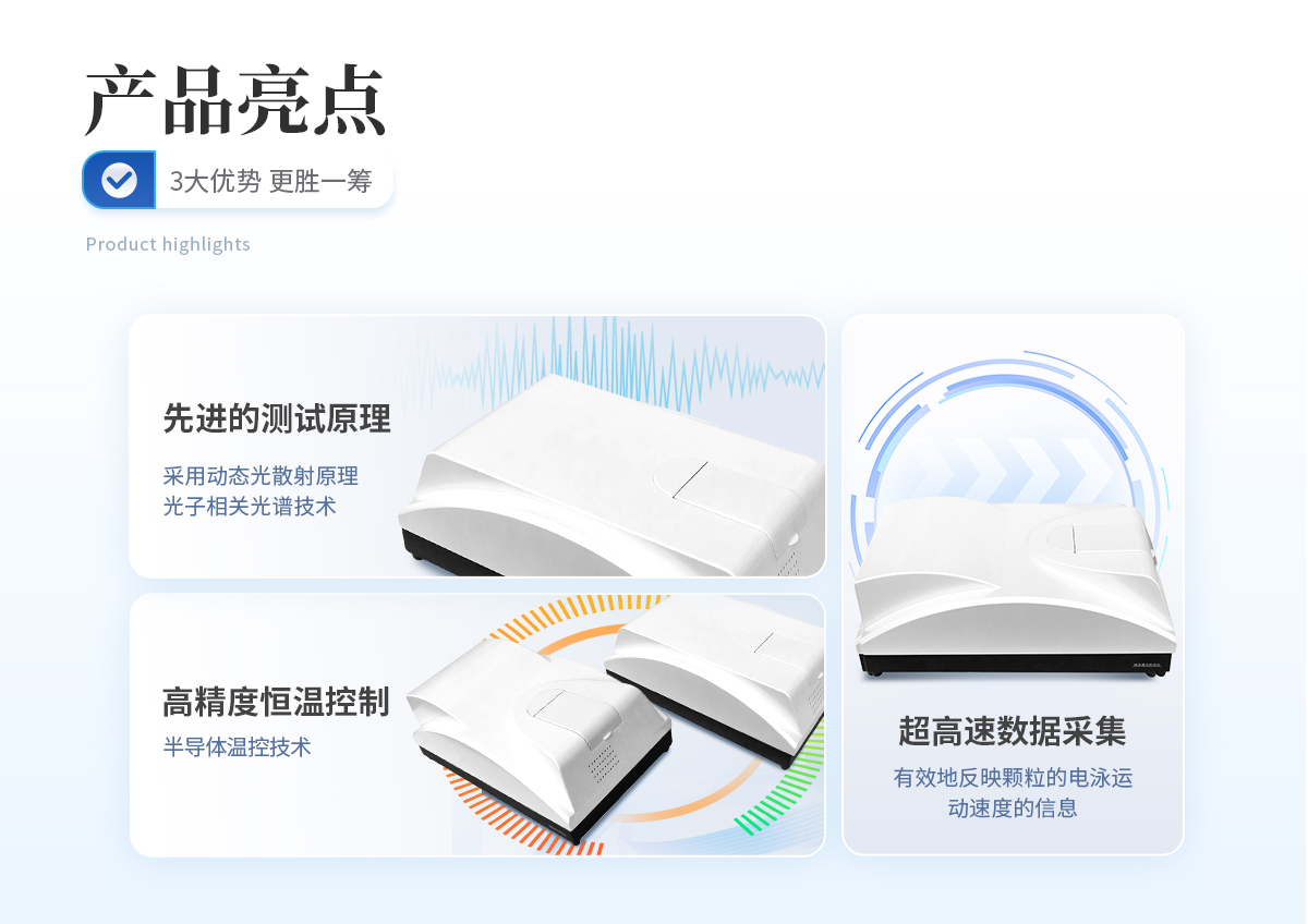 雙波長激光器,全自動切換 獨家采用雙波長(λ= 405nm、λ= 532nm)激光器搭建而成的光路系統,相關譜探測系統不僅體積小,而且具有很強的抗干擾能力,從而保證了測試的穩定性;對某些具有吸光屬性,傳統單一波長激光器無法檢測的樣品,可進行有效檢測;**的測試原理 采用動態光散射原理和光子相關光譜技術,根據顆粒在液體中的布朗運動速度測定顆粒大小。大小顆粒運動速度不同,激光照射這些顆粒,不同大小的顆粒將使散射光發生快慢不同的漲落起伏。光子相關光譜法就根據特定方向的光子漲落起伏分析其顆粒大小。超高速數據采集 使用PCS技術測定納米級顆粒大小,必須能夠分辨納秒級信號起伏。本儀器的核心部件采用我公司研制的CR256數字相關器,具有識別8ns的**分辨能力和**的信號處理速度,其數據處理速度高達162M。它能實時完成動態散射光強的采集和自相關函數運算,從而有效地反映不同大小顆粒的動態分光散射信息,為測試結果的準確性典型基礎。高靈敏度和信噪比 采用專業級高性能光電倍增管,對光子信號具有**的靈敏度和信噪比。高精度雙溫控保護系統 采用半導體溫控技術,樣品池溫控系統和激光器溫控系統精度高達±0.1℃,使被測樣品和激光器光源在整個測試過程中都處于恒溫狀態,避免溫度變化對不測試結果的影響,確保測試準確和重復;穩定的光路系統 采用光纖技術搭建而成的光路系統,使光子相關譜探測系統不僅體積小,而且具有很強的抗干擾能力,從而保證了測試的穩定性。