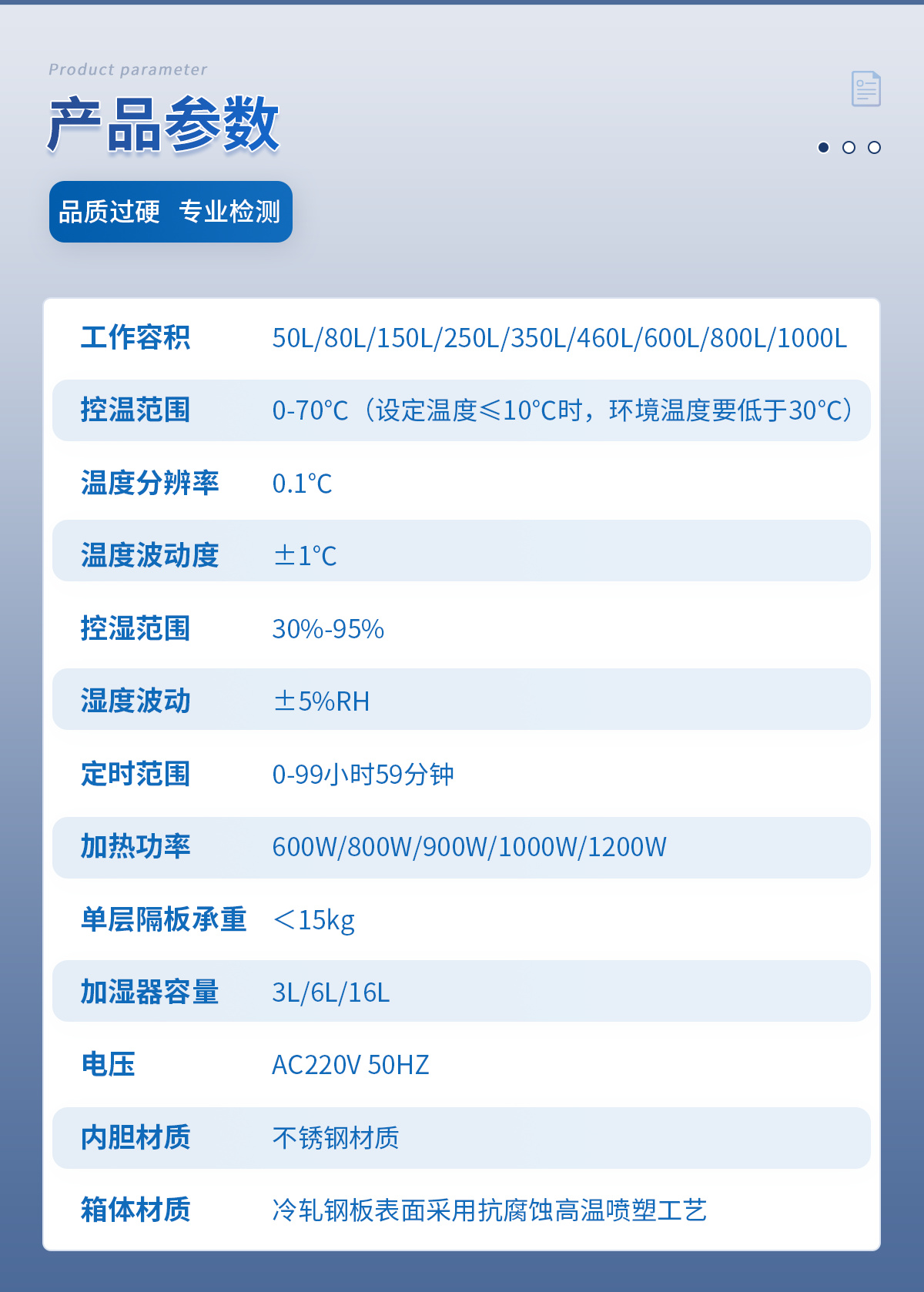| 工作容積:80L | 箱內(nèi)照明:日光燈 | 控溫范圍:0-70℃(設(shè)定溫度≤10℃時(shí)環(huán)境溫度要低于30℃) | 程序控制:24段 | 溫度分辨率:0.1℃ | 溫度波動(dòng)度:±0.5℃ | 控濕范圍:30%-95% | 定時(shí)范圍:0-99小時(shí)59分鐘 | 加熱功率:600W | 內(nèi)箱尺寸 寬*深*高(cm):45*34*45 | 外箱尺寸 寬*深*高(cm):59*58*102 | 隔板層數(shù)(標(biāo)配):2層 | 層間隔/mm:19 | 卡槽層數(shù):8 | 加濕器容量(標(biāo)配):3L | 單層隔板承重:<8kg | 底部總承重:20kg | 電壓:AC220V 50HZ | 整機(jī)重量:54kg | 內(nèi)膽材質(zhì):不銹鋼材質(zhì) | 箱體材質(zhì):冷軋鋼板表面采用抗腐蝕高溫噴塑工藝 |