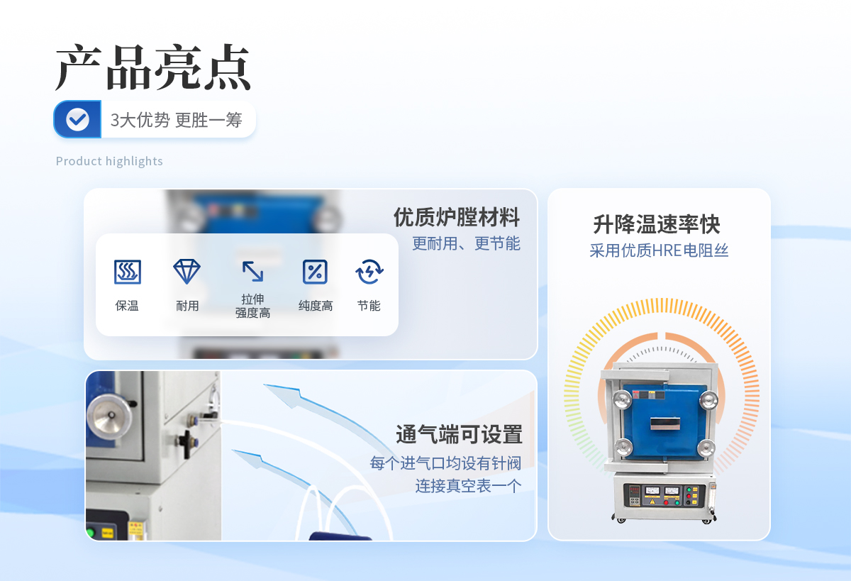 1、爐膛采用優質氧化鋁纖維材料,保溫性能好,耐用,拉伸強度高,無雜球,純度高,節能效果明顯;2、加熱元件采用優質HRE電阻絲,大大提高了其使用壽命;3、超溫報警,漏電保護,操作安全可靠。