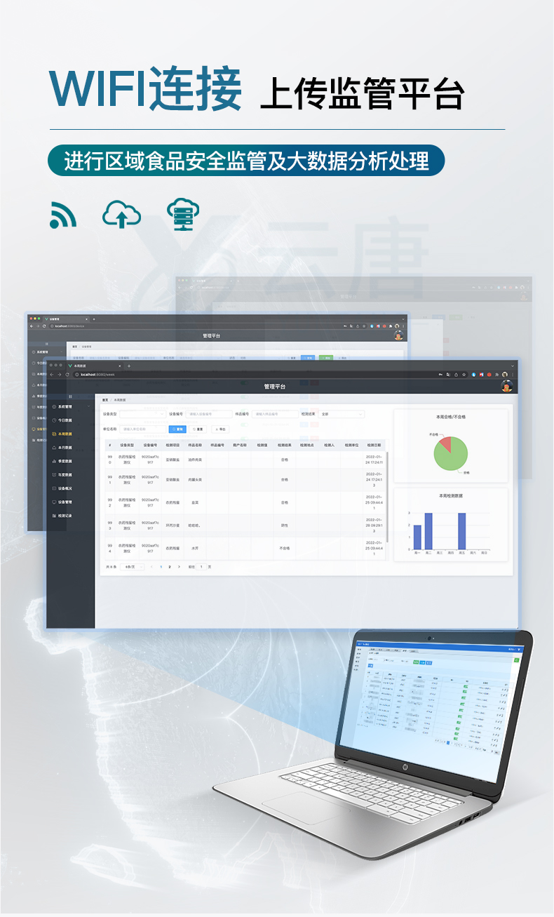 9.6、數據監管系統:同步對接監管平臺,數據可局域網和互聯網數據上傳,檢測結果可選擇直接傳至食品安全監管平臺。進行區域食品安全監管及大數據分析處理與數據統計,檢測區域食品安全長短期動態,達到食品安全問題預估、預警。