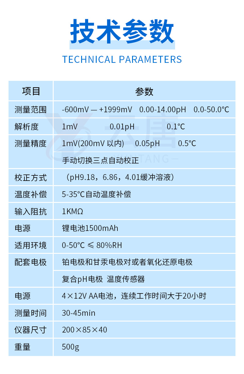 測(cè)量范圍:-600mV — +1999mV 0.00-14.00pH 0.0-50.0℃